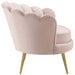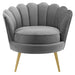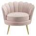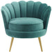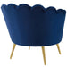 Take a stroll to tranquil waves and ocean's expanse with the Admire Scalloped Edge Performance Velvet Accent Armchair. Scalloped seashell edges and vertical channel tufting create artful elegance in your living room, lounge room, entryway, bedroom, or other seating areas. Showcasing an organic barrel back design, Admire comes with a generously padded round seat for plush comfort. Admire is upholstered in soft, stain-resistant performance velvet upholstery covering dense foam padding and individually wrapped spring coil system. Four tapered and splayed brushed gold stainless steel dowel legs support the glamorous eye-catching elegance of this luxurious accent armchair. Set Includes: One - Admire Scalloped Edge Accent Armchair Performance Velvet Polyester Upholstery Durable Stain-Resistant Fabric Gold Stainless Steel Legs Individually-Wrapped Pocket Coils Non-Marking Foot Caps Assembly Required Chair Weight Capacity: 300 lbs. Overall Product Dimensions: 31.5"L x 32.5"W x 29"H Seat Dimensions: 23.5"L x 21.5"W x 18.5"H Backrest Height: 10.5"H Armrest Height from Seat: 6.5"H Cushion Thichkness: 4.5"H Leg Dimensions: 1.5"W x 8.5"H
