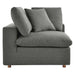 A haven for cozy relaxation, Commix features plush comfort, clean-lined design, and spacious profile, that makes an attractive statement in the modern home. Upholstered in soft polyester fabric, this contemporary corner comes with solid wood construction and cotton and down cushions for a luxurious sink-in feel. Commix comes with generously padded down feather and cotton cushions, and padded foam bases, making this sectional sofa collection perfect for the living room, family room, or game room. Made for sprawling out or curling up, Commix beckons you and guests to sit and stay a while. Includes plastic foot glides. Corner piece includes two back pillows and a throw pillow. Weight Capacity: 331 lbs. Set Includes: One - Commix Down Filled Overstuffed Corner Chair Contemporary Modern Corner Seat 85% Polyester/15% Linen Fabric Upholstery Density Foam Seat Down Feather and Cotton Cushions Solid Wood Construction Assembly Required Chair Weight Capacity: 331 lbs. Overall Product Dimensions: 40"L x 40"W x 35"H Armrest Height: 22.5"H Leg Dimensions: 2"W x 2"H Seat Dimensions: 24.5"L x 24.5"W x 19"H