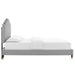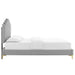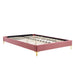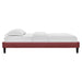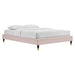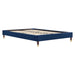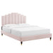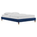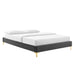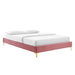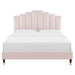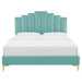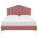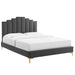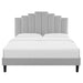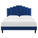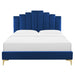 Refresh your master bedroom or guest suite with the luxurious style of the Elise Performance Velvet King Platform Bed. Abounding in glam deco style, the king headboard of this platform bed features a modern twist on classic channel tufting with velvety panels ascending upwards in an arching design. Resting atop wood legs with gold metal sleeves, this upholstered bed is covered in soft, stain-resistant performance velvet and dense foam padding. This king size bed is a sturdy mattress foundation for memory foam, innerspring, latex, and hybrid mattresses. With supporting legs and a reinforced center beam, this upholstered bed is complete with a poplar wood slat support system that offers lasting stability. Assembly required. King Bed Weight Capacity: 800 lbs.