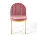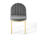 Reinvent your dining room decor with the vintage glamour of the Isla Channel Tufted Performance Velvet Upholstered Dining Room Side Chair. Featuring a vintage clamshell design and the bold lines of channel tufted accents, the Isla Dining Accent Chair is a piece to be remarked upon by guests and friends. Dense foam padding provides a comfortable seat, while soft and stain-resistant performance velvet polyester upholstery creates a luxe elegance for long-lasting use. The curved gold stainless steel frame on the Isla Side Chair has four legs with non-marking foot caps to protect flooring. Chair Weight Capacity: 331 lbs.
