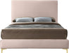 Provide yourself with a few options when you choose the sleek Geri pink velvet queen size bed. The headboard, side rails and footboard are all cushioned and upholstered, with snazzy decorative piping on the headboard and footboard. This bed comes with two different sets of legs so you can match your other d?�cor. Use the gold ones, the chrome ones, or two of each color for a truly contemporary approach.