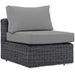 Experience the outdoors with exceptional comfort and quality. Summon Outdoor Patio Armless Sectional Sofa Chair offers an exquisite two-tone synthetic rattan weave, plush all-weather cushions with industry-leading Sunbrella� fabric, UV protection, and a sturdy powder-coated aluminum frame. Featuring an elegant modern look, Summon Patio Armless Sofa Chair is part of an avant-garde outdoor sectional series well-equipped for enhancing patio, backyard, or poolside gatherings. This installment of the series is an Outdoor Patio Armless Sofa Chair.