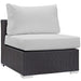 Gather stages of sensitivity with the Convene Outdoor Sectional series. Made with a synthetic rattan weave and a powder-coated aluminum frame, Convene is a versatile outdoor furniture set that shifts and combines according to the spontaneous needs of the moment. Outfitted with all-weather fabric cushions, leave a positive impression on friends and family while enhancing your patio, backyard, or poolside repast in this series of palpable distinction. This installment of the series is an Outdoor Patio Sectional Sofa Set.