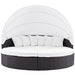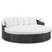 Complete your circle with four distinct wedges of joy. Quest pieces together the puzzle of experience with a fun and versatile daybed. Adjourn for your daytime repast either by yourself or with others. Like offering a friend a warm slice of pie, Quest's pieces easily separate to serve the seating needs of others. The set also comes equipped with a sun canopy to shield your leisure time with the pleasantness of shade. Courageously engaging, this is a daybed that reveals the hidden art of collaboration and communal engagement. Quest is comprised of a UV resistant rattan base, a powder-coated aluminum frame and all-weather cushions. The set is perfect for cafes, restaurants, pool areas, hotels, resorts and other outdoor spaces. Set Includes: One - Quest Circular Outdoor Patio Quarter Coffee Table One - Quest Circular Patio Daybed with Canopy Six - Quest Throw Pillows Two - Quest Circular Outdoor Patio Quarter Ottomans Modern Outdoor Daybed Synthetic Rattan Weave Machine Washable Cushion Covers Powder Coated Aluminum Frame Water & UV Resistant Ships Pre-Assembled Overall Product Dimensions: 86.5"L x 89.5"W x 31.5"H Seat Height: 17"H Top of Seat to Top of Backrest: 14.5"H Cushion Thickness: 4"H Bed Dimensions: 86.5"L x 44.5"W x 31.5"H Round Bench Dimension: 31.5"L x 31.5"W x 13"H Pillow Dimensions: 17.5"L x 17.5"W Height of Canopy: 70.5"H