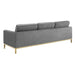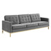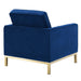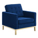 Revolutionize your living room furniture with the iconic Loft Gold Stainless Steel Leg Performance Velvet Sofa and Armchair Set. Adding visual depth to your living room or lounge space, Loft features soft and durable performance velvet upholstery accented in elegant button tufting. This modern living room set comes in a captivating linear design with an external tubular stainless steel frame, four gold stainless steel legs, and non-marking foot caps. Inspired by the richness of mid-century modern style, Loft is the preferred choice of living rooms and lounge spaces.