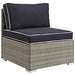 Enjoy the outdoors while benefiting from style and comfort of the Repose Outdoor Patio Furniture Series. Repose Patio Armless Sectional Sofa Chair offers a detailed tan and gray synthetic rattan weave with UV protection for eye-catching appeal and durability, plush 4� thick all-weather polyester cushions with contrasting color French piping, non-marking foot pads, and a sturdy powder-coated aluminum frame that supports up to 331 pounds. Subtle style defines the Repose outdoor sectional collection making it a natural choice for enhancing your patio, backyard, or poolside gatherings. This installment of the series is an outdoor patio armless chair.