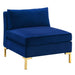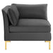 Introduce vintage modern and glam deco styles to your living space with the Ardent Performance Velvet 8-Piece Sectional Sofa. With luxe velvety texture and classic French piping, Ardent refreshes homes, apartments, and office spaces. This sectional sofa collection that allows for a variety of configurations to suit any living room, bedroom, office space, or lounge area while hidden connection buckles offer a secure fit. Covered in stain-resistant performance velvet, this sofa features dense foam padding and a sinuous spring support system for a premium seating experience. The velvet sectional sofa sits on gold metal legs with non-marking foot caps to protect your flooring. Weight Capacity for Each Sectional Sofa Piece: 440 lbs. Set Includes: Four - Ardent Armless Chair Four - Ardent Sectional Sofa Corner Chair Glam Deco Sectional Sofa Performance Velvet Upholstery Durable Stain-Resistant Fabric Dense Foam Padding Sinuous Spring Support System Gold Metal Legs w/ Non-Marking Foot Caps Weight Capacity For Each Sectional Piece: 440 lbs. Pre-installed post and clips Overall Product Dimensions: 103"L x 134"W x 29"H Overall Sectional Sofa Corner Chair Dimensions: 36"L x 36"W x 29"H Seat Dimensions: 34"L x 34"W x 18"H Backrest Dimensions: 34"W x 11"H Pillow Dimensions: 26.5"L x 10.5"W Overall Armless Chair Dimensions: 31"L x 36"W x 29"H Seat Dimensions: 31"L x 31"W x 18"H Backrest Dimensions: 31"W x 10.5"H