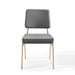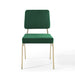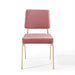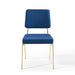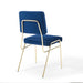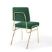 The blended aesthetics of mid-century modern style and the elegance of vintage glamour are channeled to create the striking Craft Performance Velvet Upholstered Dining Side Chair. Featuring dual densely padded foam cushions covered in soft and stain-resistant performance velvet polyester upholstery, this dining chair is a luxurious seating experience with an open, breathable design. The Craft Accent Chair sits on an eye-catching gold stainless steel frame with flared rear legs and non marking foot caps elevating your dining room, lounge room, and office decor. Chair Weight Capacity: 330 lbs. Comes Fully Assembled.