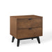 Redirect your bedroom decor with the edgy mid-century modern style of the Kali Wood Nightstand. The Kali End Table showcases beautifully grained brown ash wood veneer with a geometric chevron pattern and dual soft-close easy-glide storage drawers. Solidly constructed from wood and MDF particleboard, the Kali Accent Table rests atop splayed black legs and non-marking foot caps while standing up to your master suite or guest bedroom decor with a commanding presence. Claim center stage in your bedroom and utilize the Kali Wood Nightstand for all your bedside essentials. Assembly required.