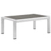 Enjoy your patio or backyard leisure time with the strong and durable Shore Outdoor Aluminum Coffee Table. Made with an anodized brushed aluminum frame and non-marking black plastic foot caps, Shore Patio Coffee Table features tone-on-tone grays with wood accents on the paneling for a chic and minimalist look. The Shore Outdoor Patio Coffee Table complements your casual gatherings with a look and functionality you can rely on.