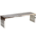 Silver rivers of laughter race back and forth in this high energy modern piece. Gridiron's sleek stainless steel bench contains a message of transformation and metamorphosis. Exuberance abounds as the strategic placement of this piece will radiate a happy atmosphere.