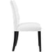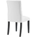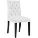Bestow elegance with the Duchess Dining Chair. Chic and luxurious, Duchess features a stylish curvy form, richly tufted button back, dense foam padding, fine vinyl upholstery, and wood legs topped with non-marking foot caps. Resonate grace and charm with a dining chair perfect for the modern home.