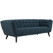 Generously update your decor with Bestow. Uniquely designed with a striking broad profile, Bestow comes finely upholstered in polyester fabric with dense foam padding and elegant button tufting. Sturdily positioned on splayed and tapered black finish wood legs with non-marking foot caps, Bestow boasts a bountiful living room seating design brimming with possibilities. With ample seat depth and overscaled frame, invite all your guests to sit comfortably in this 12" high back and arm rest collection perfect for mid-century, modern farmhouse or contemporary decors.