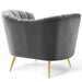 Introduce glam deco appeal with the Opportunity Vertical Channel Tufted Curved Performance Velvet Living Room Lounge Accent Armchair. Featuring a gently rolling silhouette and elegantly curved back, the Opportunity accent chair delivers a luxurious seating experience with soft, stain-resistant performance velvet upholstery, an individually wrapped pocket coil system, and dense foam padding. Complete with a removable seat cushion with a removable seat cushion, this living room armchair features interior vertical channel tufting along the interior, creating a comfortable retro-modern chair for your living room or lounge room. Opportunity's solidly constructed wood frame rests with secure precision on four splayed gold stainless steel legs and supports up to 300 lbs. Set Includes: One - Opportunity Armchair Vintage Glamour Style Stain-Resistant Performance Velvet Upholstery Vertical Channel Tufted Spring Coil System Removable Cushions Splayed Gold Stainless Steel Legs Chair Weight Capacity: 300 lbs. Overall Product Dimensions: 29.5"L x 44"W x 32"H Seat Dimensions: 22"L x 28"W x 18.5"H Backrest Dimensions: 7.5"L x 44"W x 14"H Armrest Dimensions: 29.5"L x 11"W x 28.5"H Base Dimensions: 25"L x 26"W