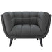 Generously update your decor with Bestow. Uniquely designed with a striking broad profile, Bestow comes finely upholstered in polyester fabric with dense foam padding and elegant button tufting. Sturdily positioned on splayed and tapered black finish wood legs with non-marking foot caps, Bestow boasts a bountiful living room seating design brimming with possibilities. With ample seat depth and overscaled frame, invite all your guests to sit comfortably in this 12" high back and arm rest collection perfect for mid-century, modern farmhouse or contemporary decors.