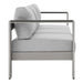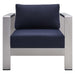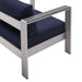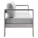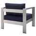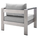 Enjoy your patio or backyard leisure time with the strong and durable Shore Aluminum 4 Piece Outdoor Patio Furniture Set. Made with anodized brushed aluminum frames and non-marking black plastic foot caps, Shore comes outfitted with resilient Sunbrella� fabric canvas cushions tested to last through all weather conditions. The Shore Outdoor Aluminum Outdoor Patio Set complements your casual gatherings with a look and functionality you can rely on. Set Includes: 1 Loveseat, 2 Armless Chairs, 1 Coffee Table
