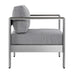 Enjoy your patio or backyard leisure time with the strong and durable Shore Outdoor Patio Arm Chair. Made with an anodized brushed aluminum frame and non-marking black plastic foot caps, Shore Patio Arm Chair comes outfitted with resilient fabric canvas tested to last through all weather conditions. The Shore Outdoor Deck Chair complements your casual gatherings with a look and functionality you can rely on.
