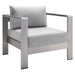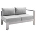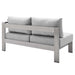 Enjoy your patio or backyard leisure time with the strong and durable Shore Outdoor Patio Aluminum 8 Piece Sectional Sofa Set. Made with anodized brushed aluminum frames and non-marking black plastic foot caps, Shore comes outfitted with resilient Sunbrella� fabric canvas cushions tested to last through all weather conditions. The Shore Outdoor Sectional Sofa Set complements your casual gatherings with a look and functionality you can rely on. Set Includes: 1 Left-Arm Sofa, 1 Right-Arm Sofa, 1 Corner Chair, 2 Armless Chairs, 1 Armchair, 1 Coffee Table, 1 Side Table