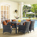 Experience the outdoors with exceptional comfort and quality. Summon Outdoor Patio Dining Table Set offers an exquisite two-tone synthetic rattan weave, plush all-weather cushions with industry-leading Sunbrella� fabric, UV protection, and a sturdy powder-coated aluminum frame. Featuring rounded arms and an elegant modern look, Summon Outdoor Dining Furniture set is part of an avant-garde outdoor sectional series well-equipped for enhancing patio, backyard, or poolside gatherings. This installment of the series is an Outdoor Patio Dining Table and Armchair Set.