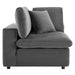 A haven for cozy relaxation, Commix features plush comfort, clean-lined design, and spacious profile, that makes an attractive statement in the modern home. Covered in stain-resistant performance velvet, this upholstered sectional sofa comes with a solid wood construction and foam padded and duck down cushions for a luxurious sink-in feel. Commix features overstuffed down feather cushions that offer a feeling of relaxation and calming comfort while lounging, making it the perfect addition to the living room, family room, or game room. Made for sprawling out or curling up, Commix beckons you and guests to sit and stay a while. Includes plastic foot glides. Weight Capacity Each Chair: 331 lbs. Set Includes: One - Commix Down Filled Overstuffed Ottoman Three - Commix Down Filled Overstuffed Armless Chair Three - Commix Down Filled Overstuffed Corner Chair Contemporary Modern Sectional Sofa Stain-Resistant Performance Velvet Density Foam Seat Down Feather and Cotton Cushions Solid Wood Construction Assembly Required Weight Capacity Each Piece: 331 lbs. Overall Product Dimensions: 119"L x 158"W x 35"H Overall Down Filled Overstuffed Armless Chair Dimensions: 40"L x 39"W x 35"H Overall Down Filled Overstuffed Corner Chair Dimensions: 40"L x 40"W x 35"H Overall Down Filled Overstuffed Ottoman Dimensions: 39"L x 40"W x 19"H Seat Dimensions: 24.5"L x 39"W x 19"H Seat Dimensions: 40"L x 40"W x 20"H Armrest Height: 22.5"H