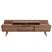 Bring mid-century inspiration to your living space with the Omnistand 74" TV Stand. Featuring a linear silhouette with rounded corners, this TV stand comes with smooth walnut grain laminate, a durable particleboard frame, sturdy splayed legs, two open shelves, a full-extension center drawer, and shelving units on either side with solid sliding doors for sophisticated media storage. Complete with cable management, Omnistand's contemporary linear style is the perfect addition to the modern living room, lounge or recreation area.