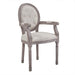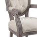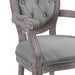 Revel in the whispered opulence of the Arise Dining Armchair. Featuring a fluted wood frame, button tufted diamond trim, elegant welting, dense foam padding, an upholstered fabric seat, and scooped armrests, this oval back dining or accent chair elegantly blends old world charm with modern intrigue. Designed with a weathered vintage French look and an undeniable appeal, Arise supports up to 331 pounds and comes with foot pads to preserve flooring. Comes fully assembled.