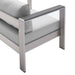 Enjoy your patio or backyard leisure time with the strong and durable Shore Outdoor Patio Aluminum 9 Piece Sectional Sofa Set. Made with anodized brushed aluminum frames and non-marking black plastic foot caps, Shore comes outfitted with resilient Sunbrella� fabric canvas cushions tested to last through all weather conditions. The Shore Outdoor Sectional Sofa Set complements your casual gatherings with a look and functionality you can rely on. Set Includes: 1 Left-Arm Sofa, 1 Right-Arm Sofa, 2 Armless Chairs, 2 Armchairs, 1 Coffee Table, 2 Side Tables Set Includes: One - Shore Coffee Table One - Shore Left-Arm Loveseat One - Shore Right-Arm Loveseat Two - Shore Armchair Two - Shore Armless Chair Two - Shore Side Table 9-Piece Outdoor Sectional Sofa Set All-Weather Sunbrella� Fabric Comfortable Dense Foam Padding Anodized Aluminum Frames Non-Marking Black Plastic Foot Caps Machine Washable Cushions Assembly Required Overall Right-Arm Loveseat Dimensions: 27.5"L x 53"W x 25"H Seat Dimensions: 27.5"L x 50"W x 16.5"H Armrest Dimensions: 27.5"L x 8"W x 25"H Backrest Dimensions: 13.5"H Seat Cushion Dimensions: 27"L x 25"W x 5"H Overall Armless Chair Dimensions: 27.5"L x 25"W x 23.5"H Seat Dimensions: 27.5"L x 23.5"W x 11"H Backrest Dimensions: 25"W x 14"H Seat Cushion Dimensions: 27"L x 25"W x 5"H Overall Coffee Table Dimensions: 23.5"L x 39.5"W x 15.5"H Floor to Underside of Table: 13"H Base Width: 17.5"W Overall Side Table Dimensions: 15.5"L x 15.5"W x 13.5"H Plastic Wood Dimension: 12.5"L x 3.5"W x 1/2"H Overall Armchair Dimensions: 27.5"L x 32"W x 25 - 30"H Seat Dimensions: 27.5"L x 25 - 27.5"W x 16.5"H Armrest Height from Seat: 8"H Backrest Height: 7"H Armrest Dimensions: 27.5"L x 0.5"W x 25"H Overall Product Dimensions: 125.5"L x 170"W x 25"H
